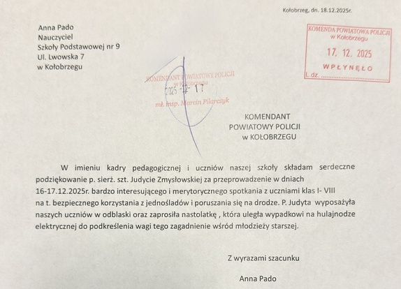 Do Komendy Powiatowej Policji w Kołobrzegu wpłynęło oficjalne podziękowanie od Szkoły Podstawowej nr 9 za przeprowadzenie zajęć profilaktycznych dotyczących bezpieczeństwa w ruchu drogowym.