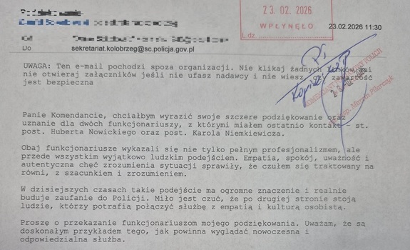 Do Komendy Powiatowej Policji w Kołobrzegu w ostatnich dniach wpłynęły kolejne wiadomości z podziękowaniami dla funkcjonariuszy. Autorzy maili podkreślają profesjonalizm, empatię oraz zaangażowanie policjantów w codziennej służbie. Takie słowa uznania są dla mundurowych szczególnie cenne, pokazują, że ich praca jest zauważana i doceniana przez lokalną społeczność.
