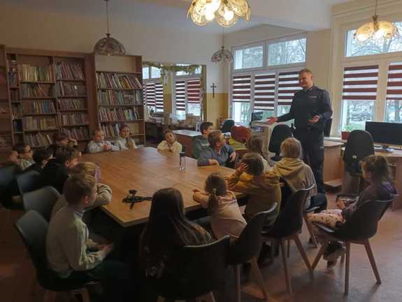 Około 40 dzieci uczestniczących w półkoloniach „Ferie na wesoło” w Szkole Podstawowej nr 8 w Kołobrzegu wzięło udział w spotkaniu profilaktycznym z policjantem.