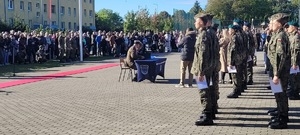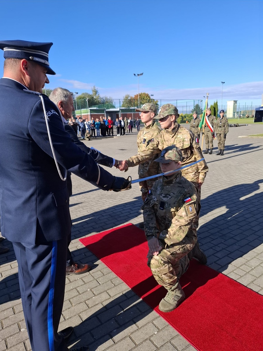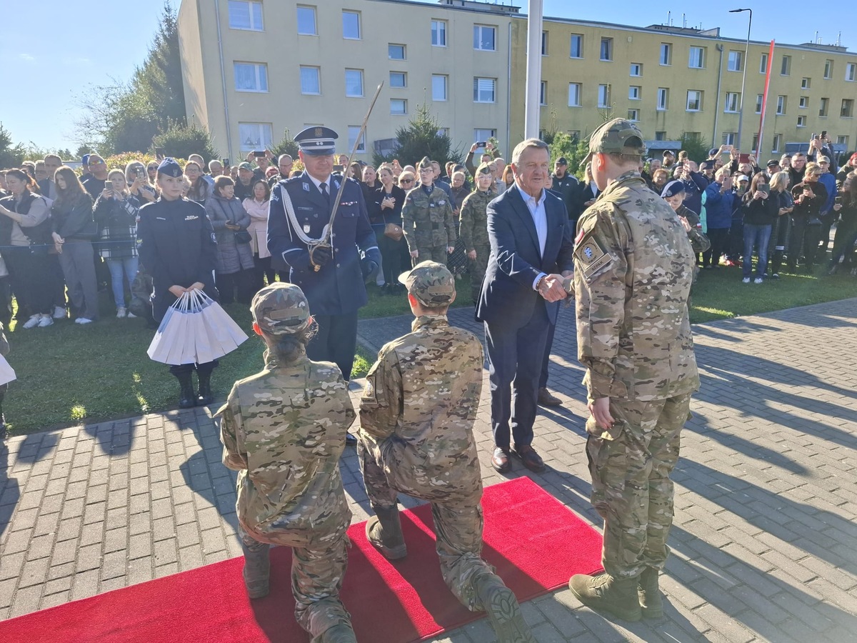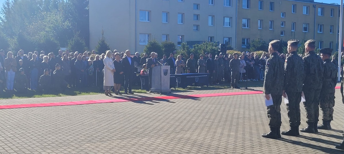 To był wyjątkowy moment dla uczniów Zespołu Szkół im. Macieja Rataja w Gościnie. W dniu 3 października br. odbyło się uroczyste ślubowanie i zarazem pasowanie uczniów klas pierwszych. W roku szkolnym 2025/2026 pasowani zostali uczniowie klas oddziału przygotowania wojskowego - objętego patronatem Ministerstwa Obrony Narodowej oraz oddziału mundurowego o profilu policyjnym i straży granicznej - objętej patronatem Ministerstwa Spraw Wewnętrznych i Administracji. W uroczystości wzięli udział Sekretarz Stanu Ministerstwa Spraw Wewnętrznych i Administracji Wiesław Szczepański oraz Podsekretarz Stanu w Ministerstwie Obrony Narodowej Stanisław Wziątek. Wśród zaproszonych gości byli też przedstawiciele władz samorządowych i wojewódzkich oraz reprezentanci służb mundurowych m.in. Komendant Powiatowy Policji w Kołobrzegu - mł. insp. Marcin Pilarczyk oraz Z-ca Naczelnika Wydziału Prewencji Komendy Wojewódzkiej Policji w Szczecinie - nadkom. Emil Fijałkowski, a także powiatowy i wojewódzki koordynator oddziału klas mundurowych.