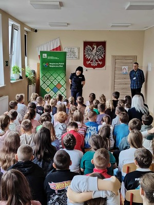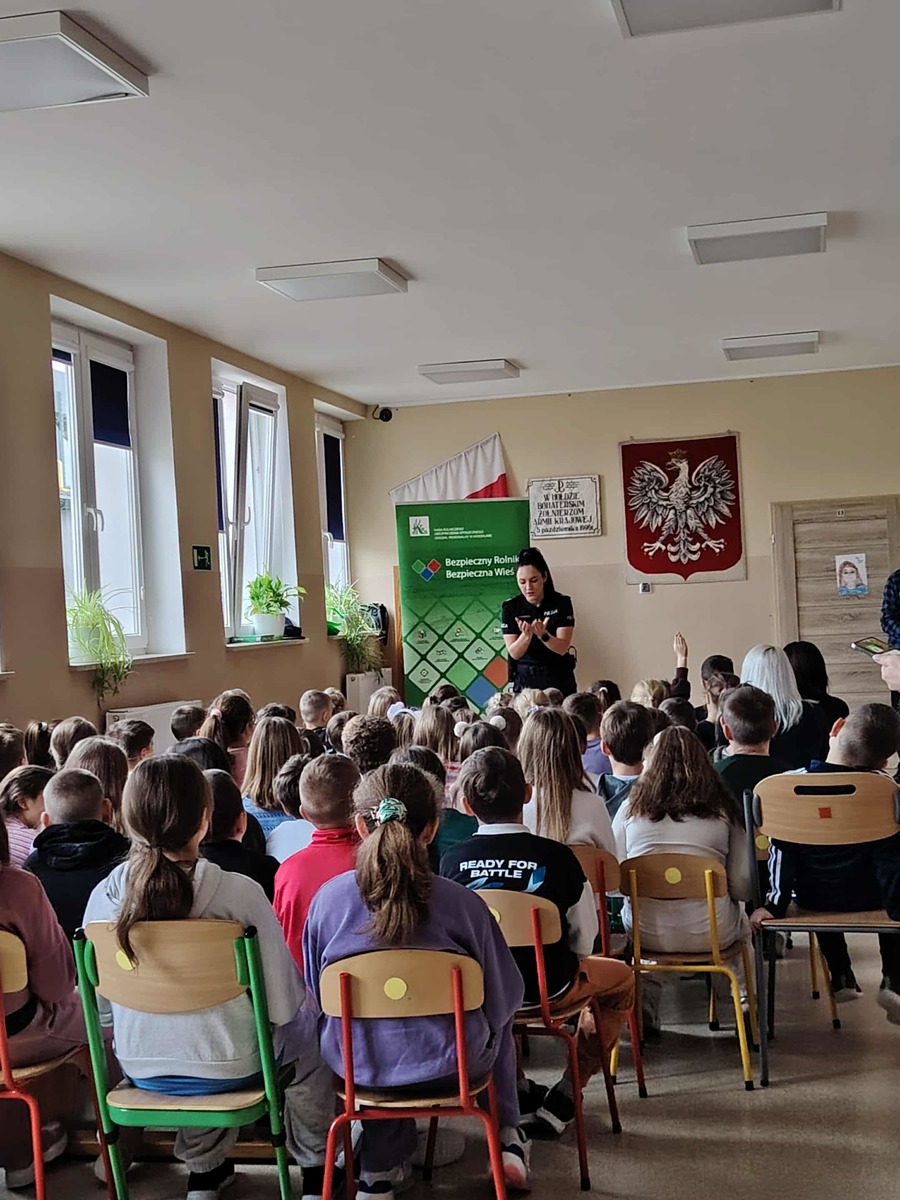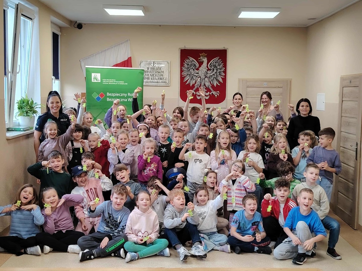 W ramach działań profilaktycznych funkcjonariusze z Komendy Powiatowej Policji w Kołobrzegu oraz przedstawiciele KRUS przeprowadzili pogadankę dla dzieci z klas I–III. Uczniowie przypomnieli sobie podstawowe zasady bezpiecznego przechodzenia przez jezdnię, poruszania się chodnikiem oraz noszenia odblasków. Spotkanie miało charakter edukacyjny, ale i praktyczny – każde dziecko otrzymało odblask, by być lepiej widoczne na drodze.