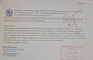 Po przekazaniu darów na skrzynkę mailową Komendy Powiatowej Policji w Kołobrzegu wpłynęły oficjalne podziękowania od prezes fundacji, Ewy Wiśnios. W swoim mailu podkreśliła ona zaangażowanie policjantek oraz wszystkich osób uczestniczących w zbiórce, zaznaczając, że inicjatywa ta pokazuje, iż na funkcjonariuszy można liczyć nie tylko w sytuacjach zagrożenia, ale również w działaniach pełnych empatii i troski o najsłabszych.