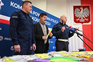 Podczas dzisiejszego spotkania w Komendzie Powiatowej Policji w Kołobrzegu starosta przekazał funkcjonariuszom 4 tysiące elementów odblaskowych przeznaczonych do działań profilaktycznych.